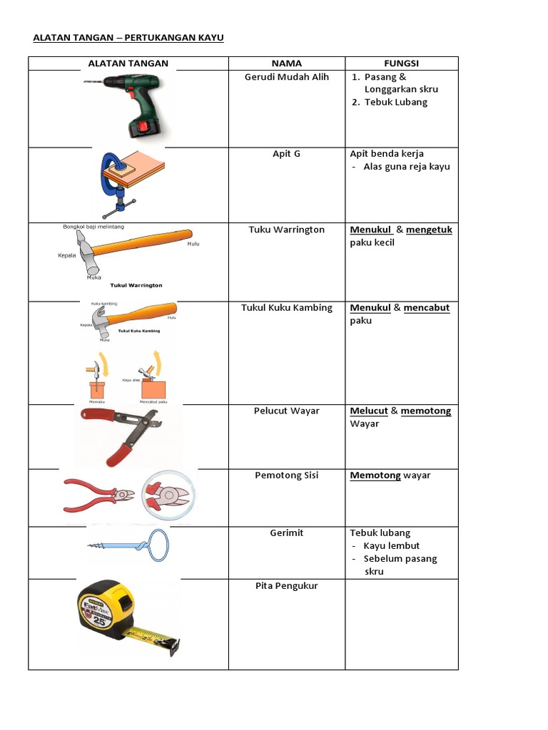 Pengenalanpada amnya alatan tangan dalam kerja kayudapat dikelompokan kepada 1 1. Alat memukul dan memutar. Ragum kakak tua alat tangan ini digunakan untuk mengeluarkan paku memotong dawai dan sebagainya. Berikut kami berikan daftar perkakas dan peralatan untuk tukang kayu.