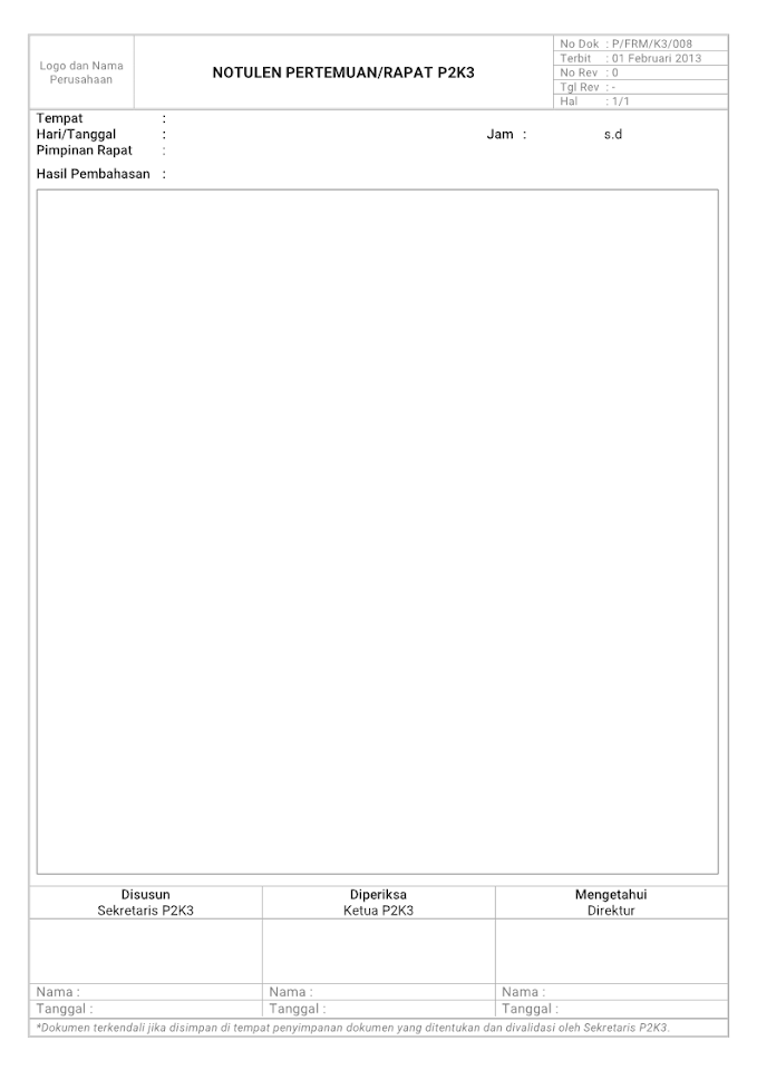 Formulir Notulen Pertemuan Rapat K3 Manajemen K3 Umum