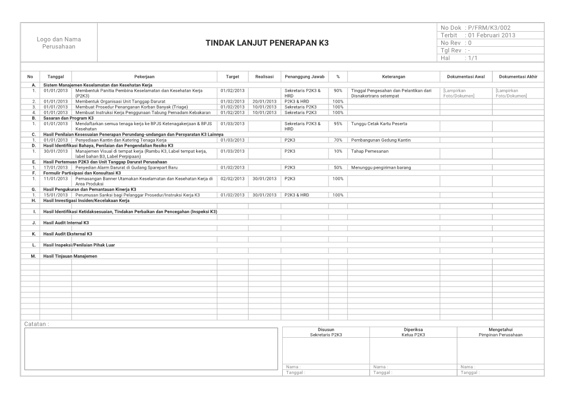 Formulir Tindak Lanjut Penerapan K3 Manajemen K3 Umum
