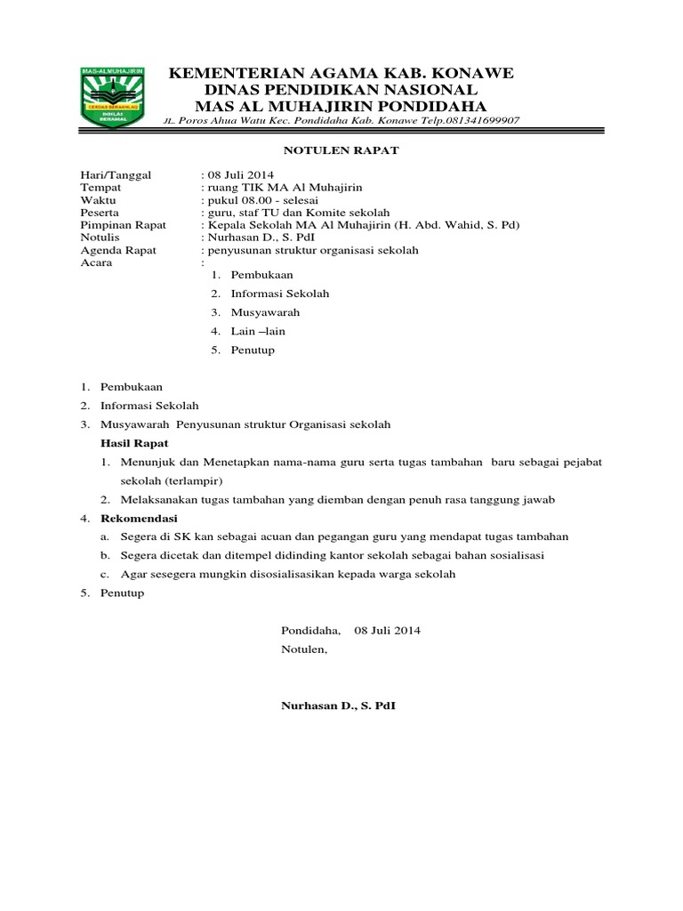 Contoh Notulen Rapat Penetapan Struktur Organisasi Sekolah