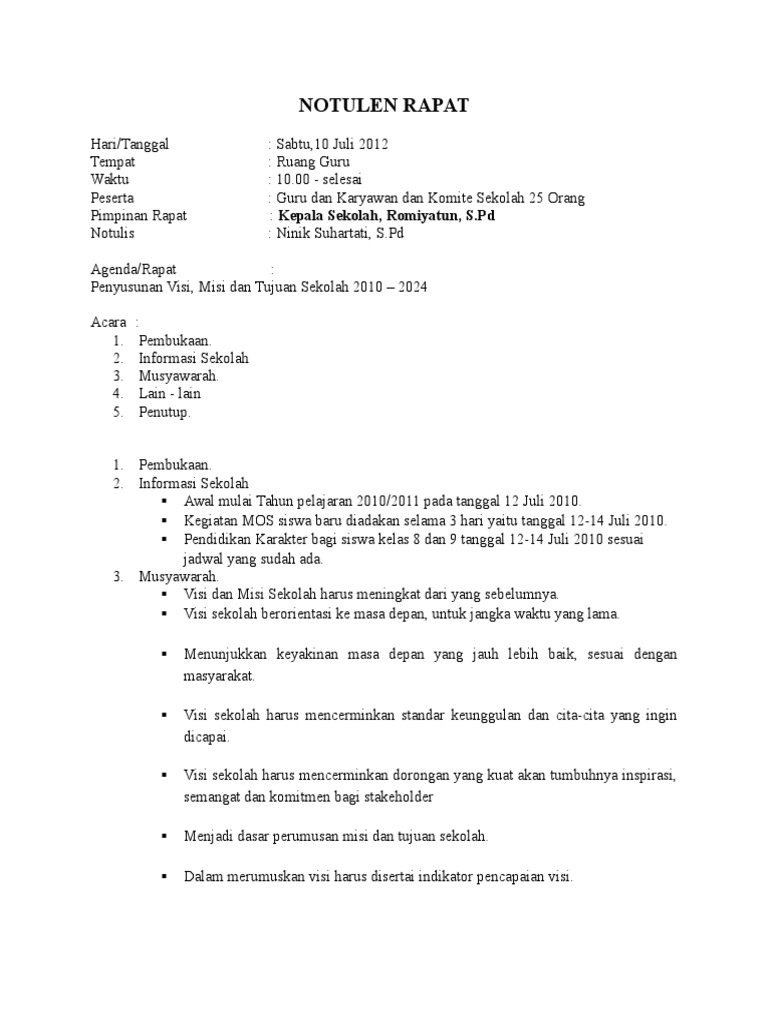 Contoh Notulen Rapat Visi Misi Dan Tujuan Sekolah Temukan Contoh