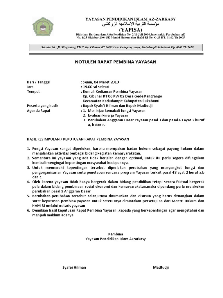 Contoh Risalah Rapat Pembina Yayasan