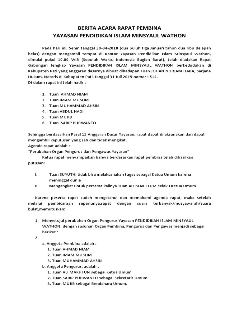 Contoh Berita Acara Pengurus Yayasan Rasmi Ri