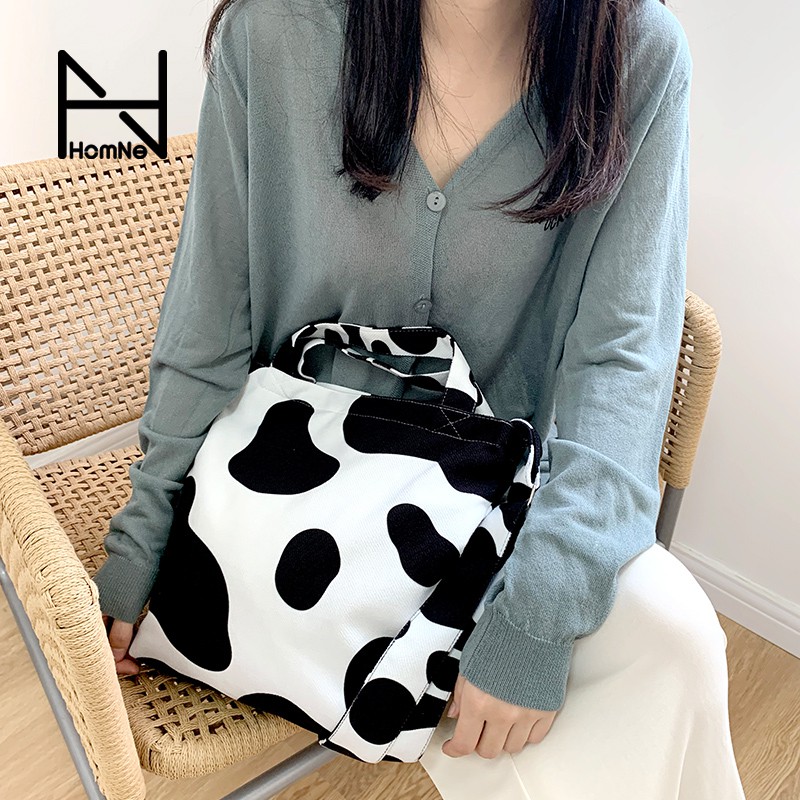 Tas Bahu Selempang Bahan Kulit Sapi Warna Hitam Putih Gaya Hong