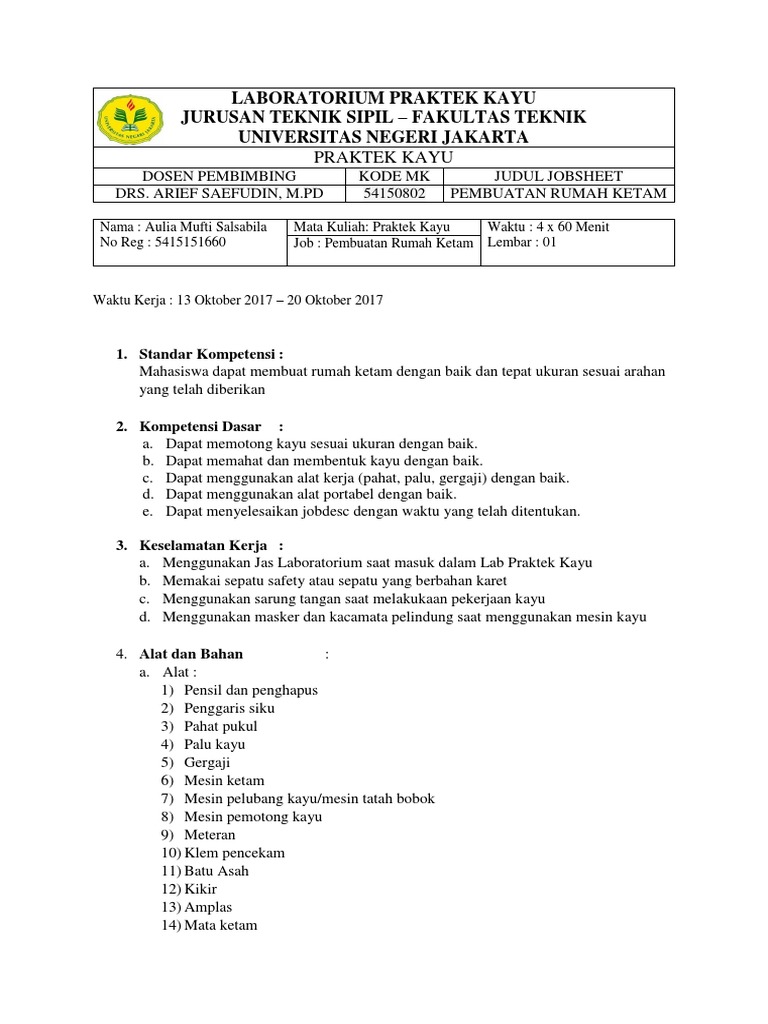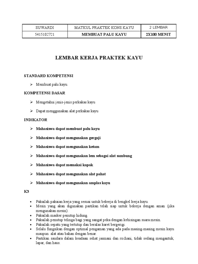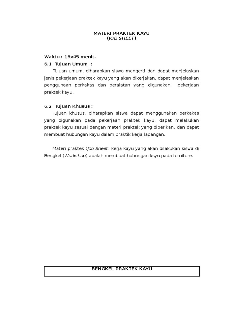 Kesehatan dan keselamatan kerja k3 pakailah pakaian kerja yang sesuai untuk bekerja di bengkel kerja kayu. Praktikum kerja bangku adalah suatu kegiatan untuk menyelesaikan suatu jobsheet dengan menggunakan cara manual sebagai bekal mahasiswa untuk melatih kemamapuan siswa dalam mengaplikasikan teori kedalam praktek yang riil serta sebagai bekal dasar untuk menempuh matakuliah yang selanjutnya. Penilaian kognitif afektif psikomotor siswa evaluasi dan tugas tugas. Jobsheet pembuatan sambungan t kayu praktek kayu.