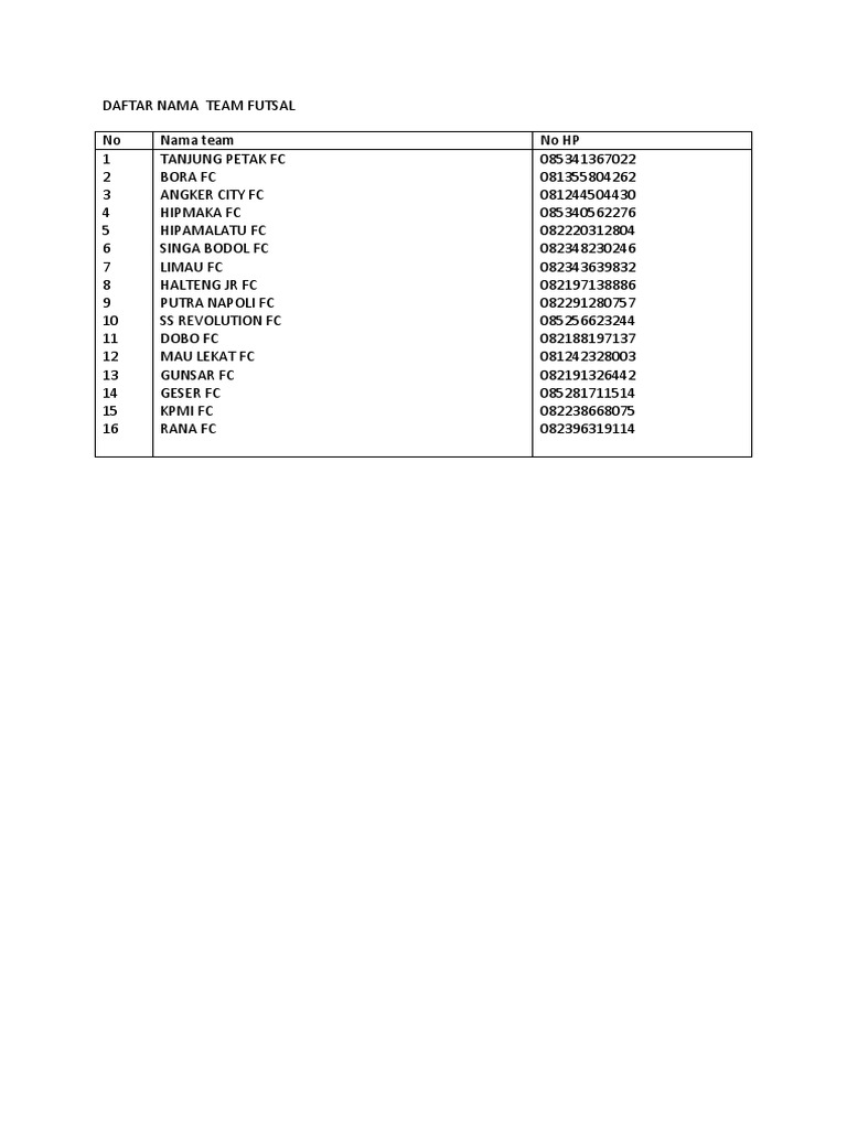 Daftar Nama Team Futsal