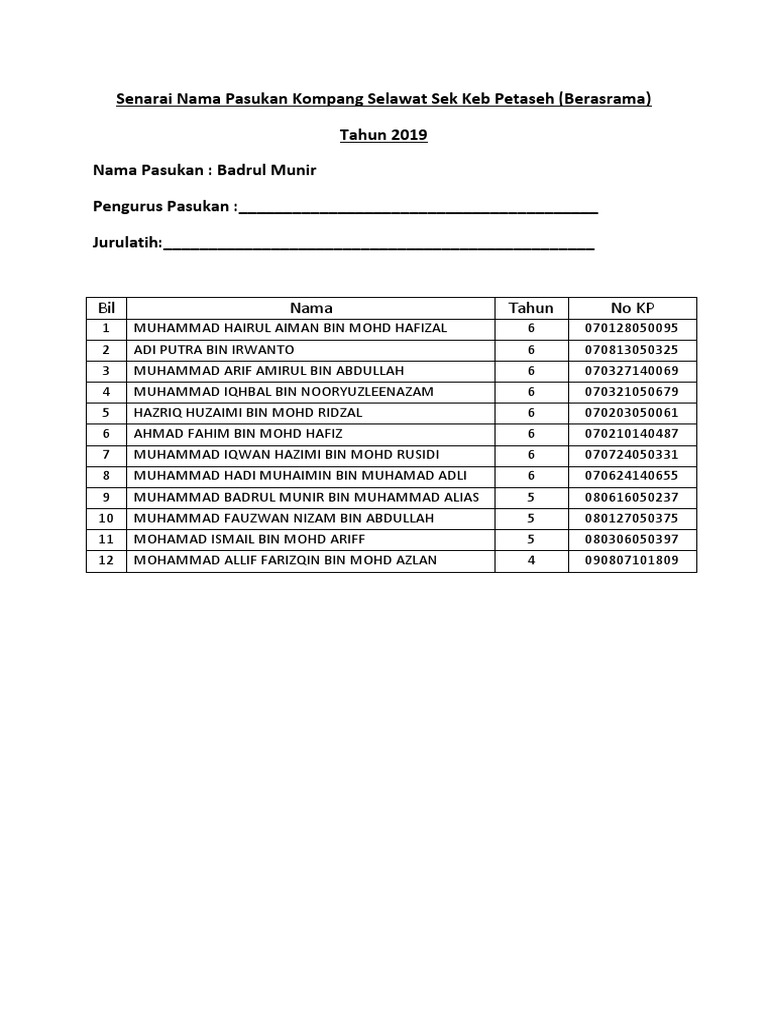 Senarai Nama Pasukan Kompang Selawat Sek Keb Petaseh Badrul Munir Docx